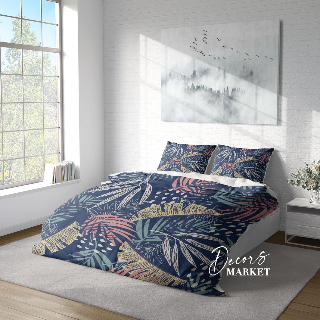 Banana Leaves Duvet Cover Set w Pillowcases, Blue bg Tropical Floral Leaves 3D Quilt Cover, 3pc Single Double Queen King Size Doona Cover