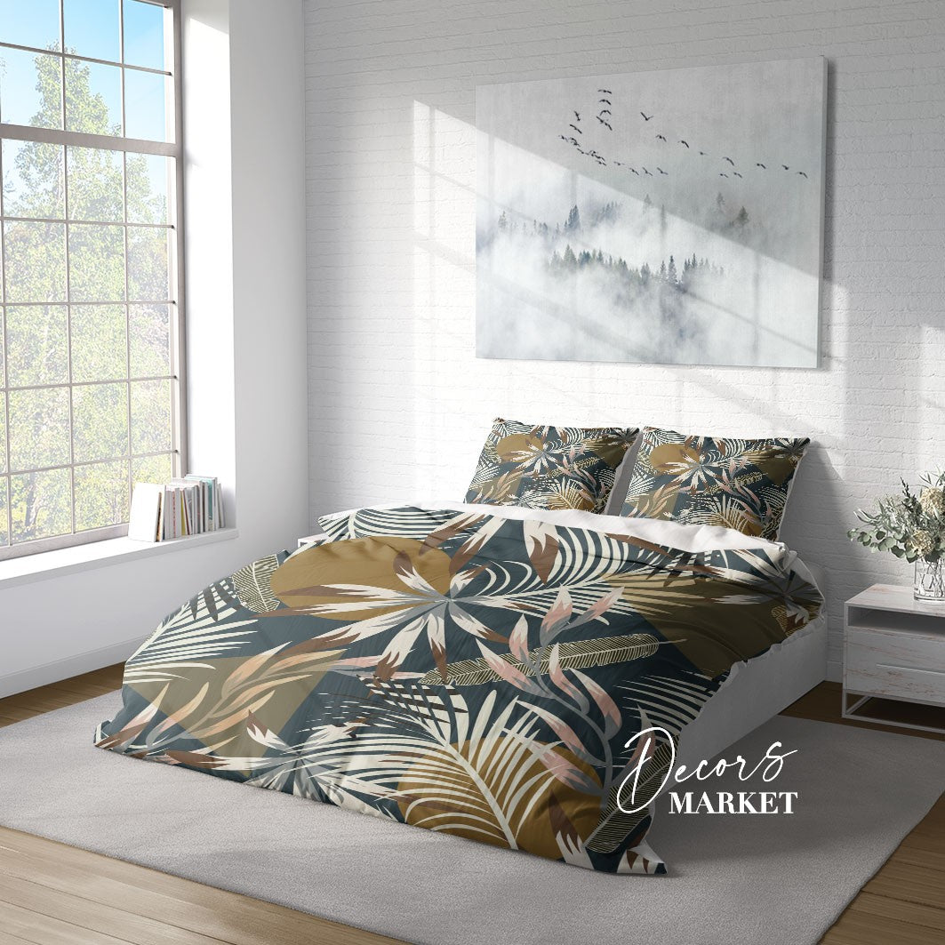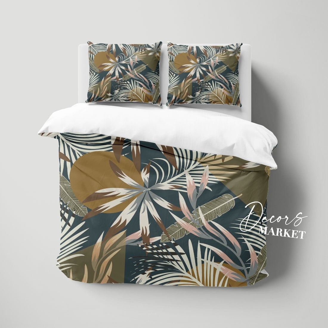 Banana Leaves Duvet Cover Set w Pillowcases, Dark bg Tropical Floral Leaves 3D Quilt Cover, 3pc Single Double Queen King Size Doona Cover