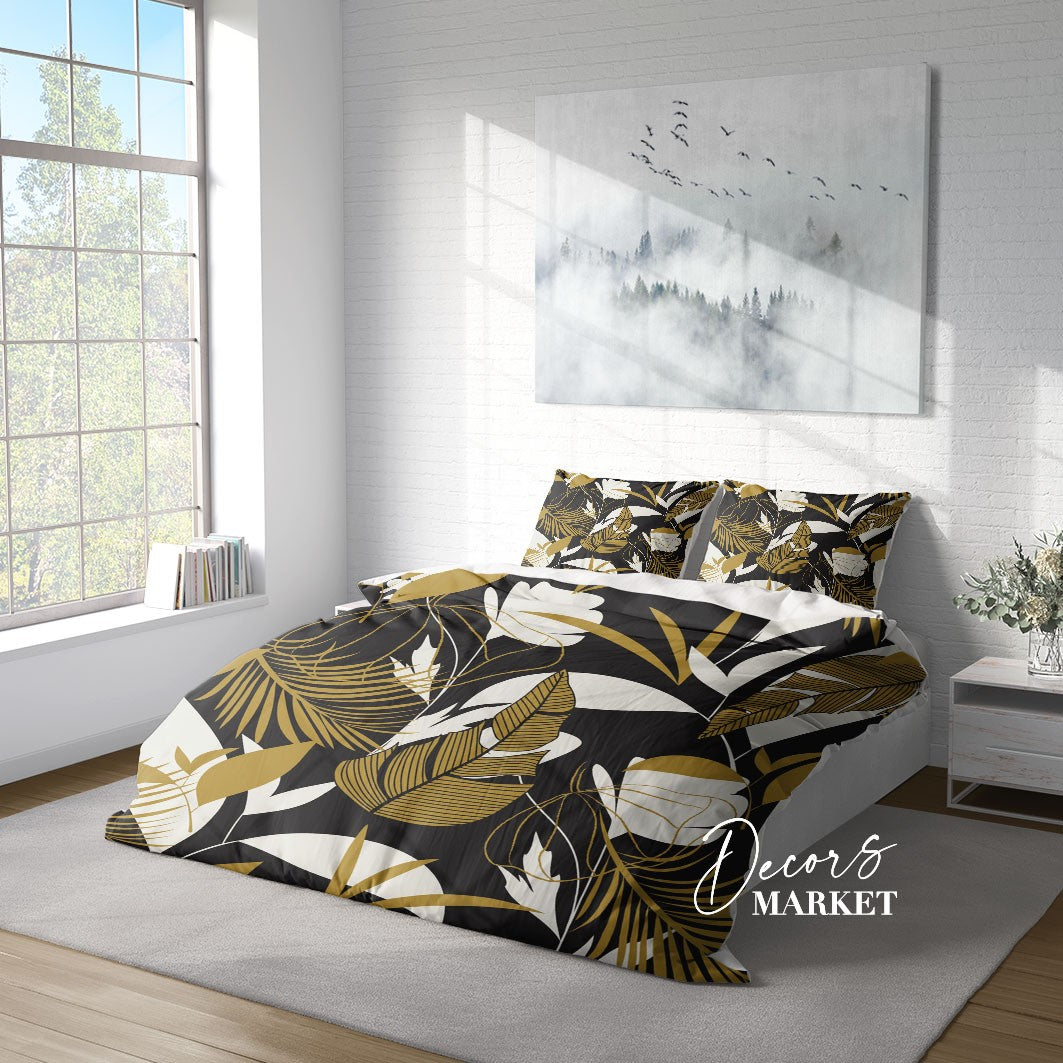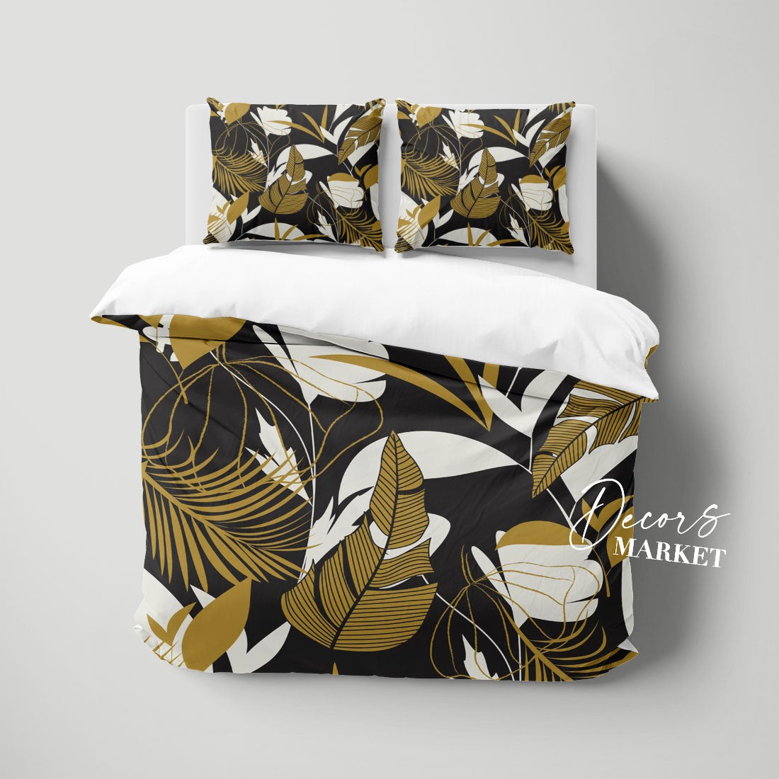Banana Leaves Duvet Cover Set w Pillowcases, Black bg Tropical Floral Leaves 3D Quilt Cover, 3pc Single Double Queen King Size Doona Cover