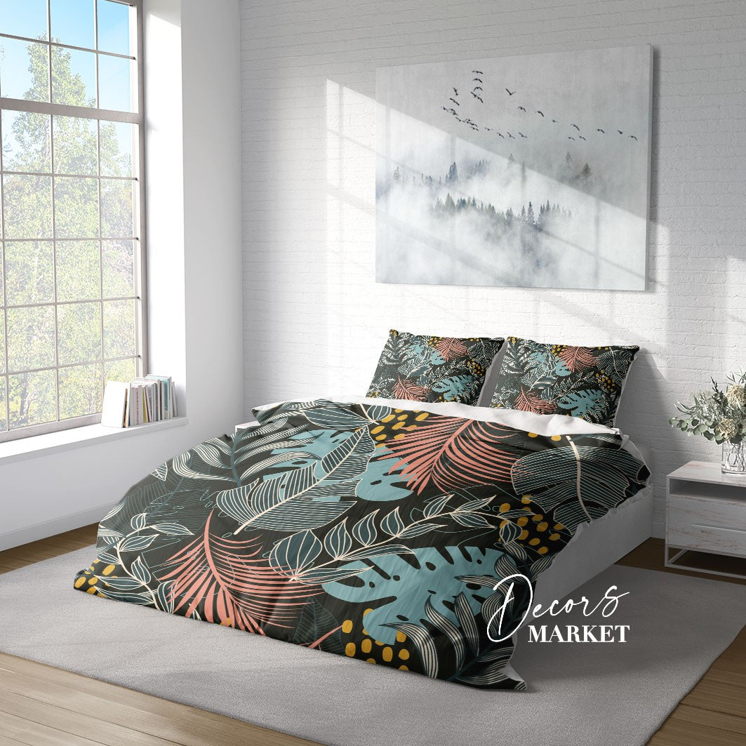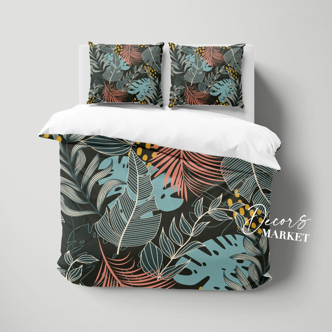 Banana Leaves Duvet Cover Set w Pillowcases, Black bg Tropical Floral Leaves 3D Quilt Cover, 3pc Single Double Queen King Size Doona Cover
