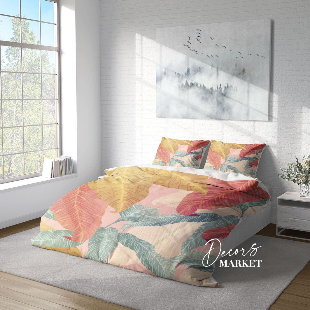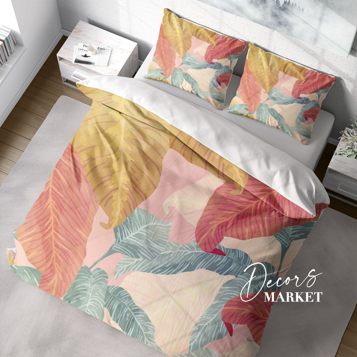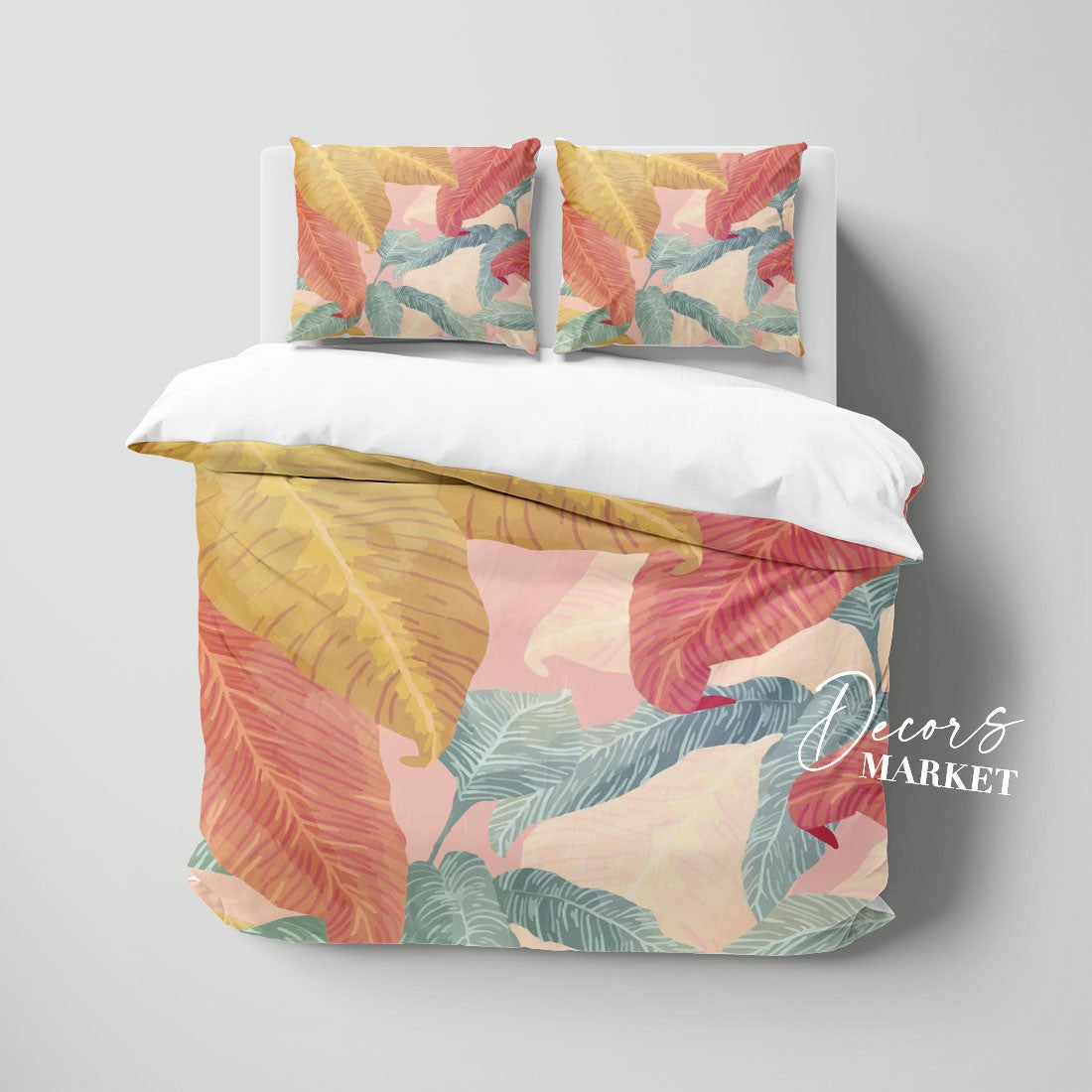 Banana Leaves Duvet Cover Set w Pillowcases, Pink Pastel Floral Leaves 3D Quilt Cover, 3pc Single Double Queen King Size Doona Cover