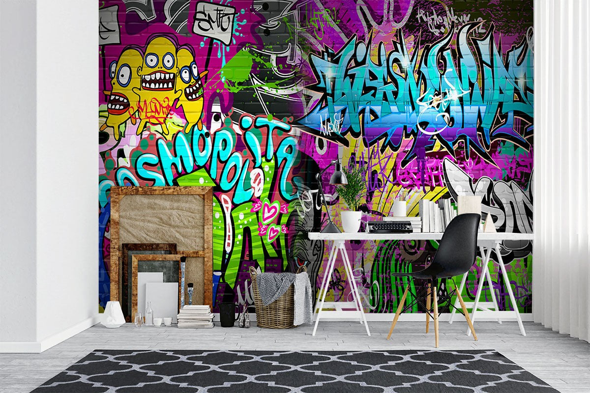 Cartoony Characters Graffiti Multicolour Wallpaper Mural,Self-Adhesive Peel And Stick 3D Wall Paper,Bedroom Removable Wall Decor
