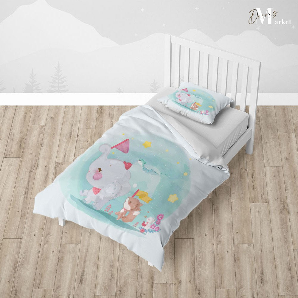 Elephant Play Friends Duvet Cover Set w Pillow Cover, Green Kids Cartoon 3D Quilt Cover, Single Double Queen King Size Doona Cover