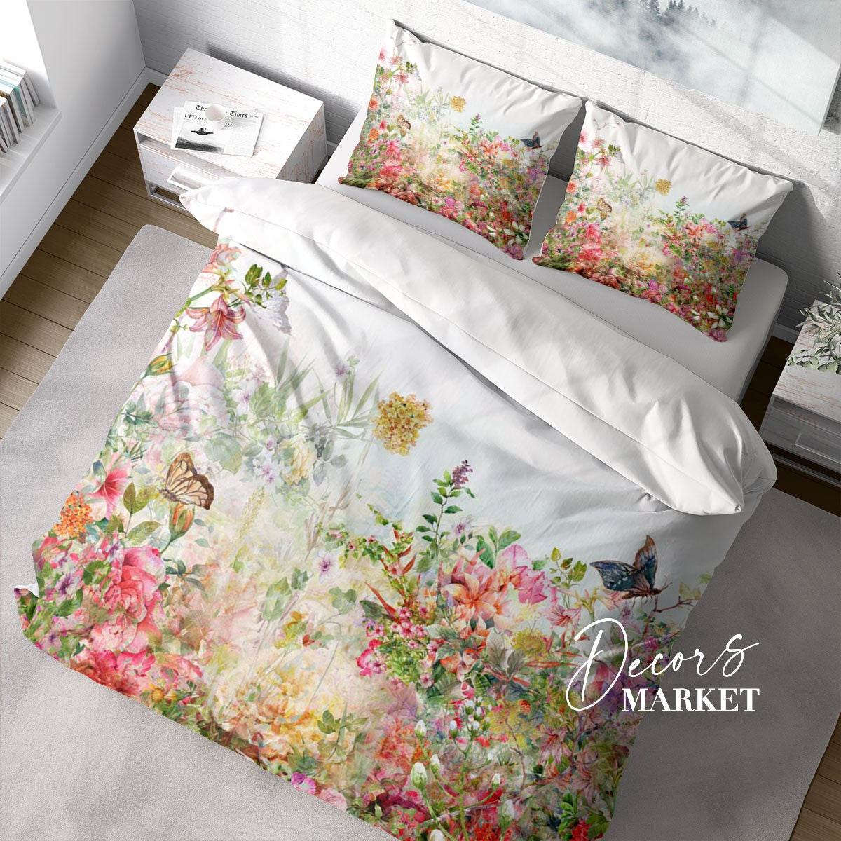 Garden Butterfly Watercolor Duvet Cover Set w Pillowcases, Colorful Floral Flowers 3D Quilt Cover, 3pc Double Queen King Size Doona Cover