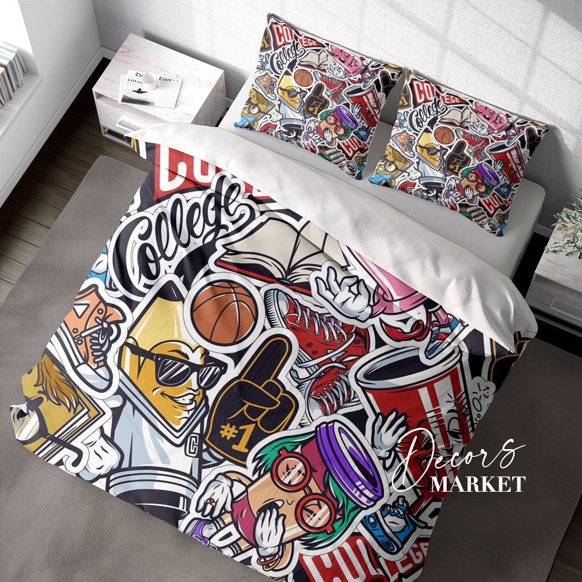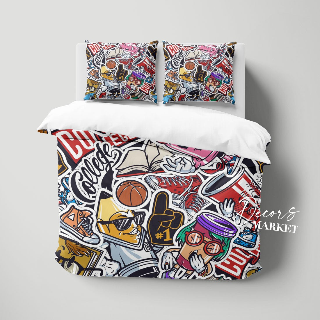 Stickers Duvet Cover Set w Pillowcases, Colorful Graffiti Sticker 3D Quilt Cover, 3pc Single Double Queen King Size Doona Cover