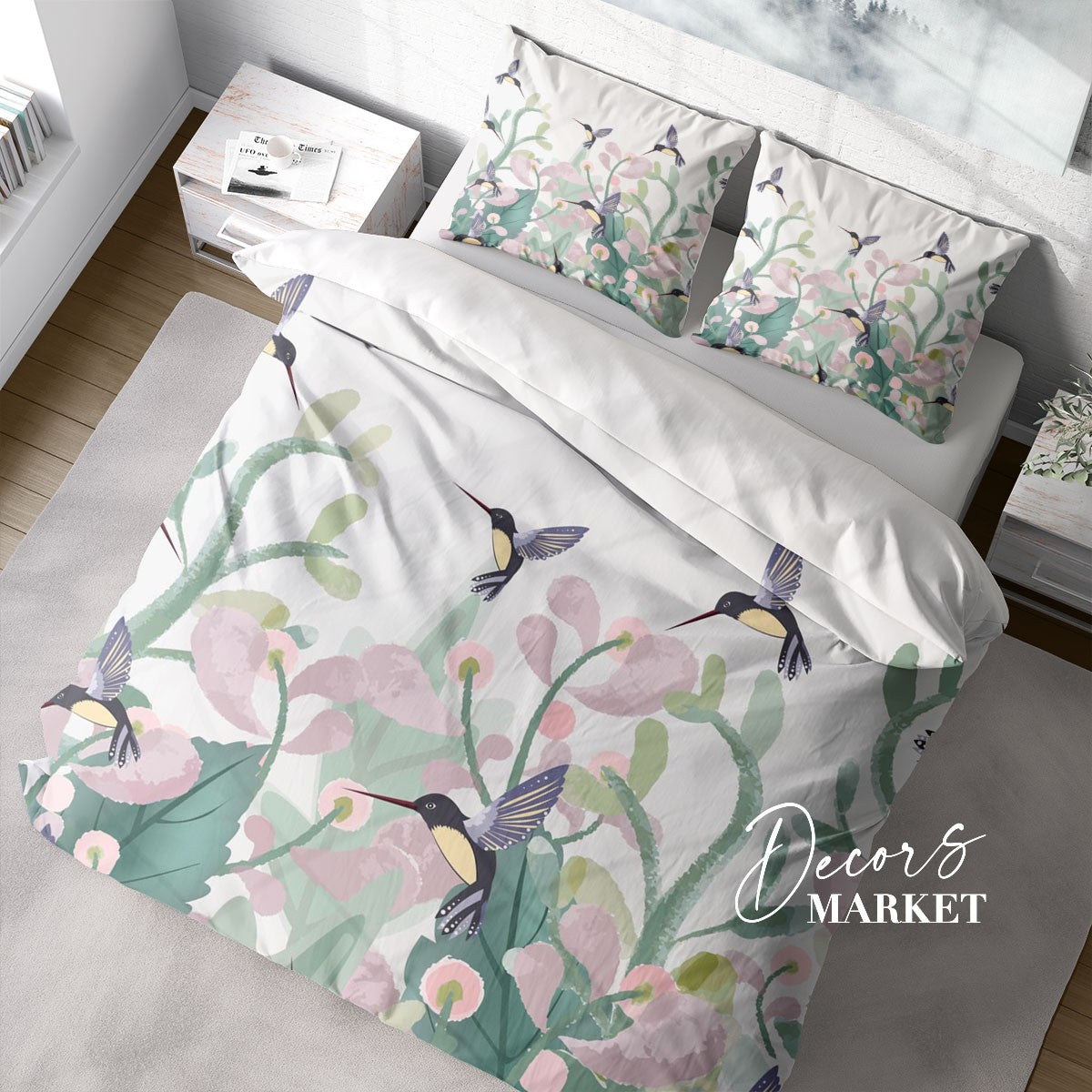 Hummingbird Duvet Cover Set w Pillowcases, Pastel Green Floral Flowers Birds 3D Quilt Cover, 3pc Single Double Queen King Size Doona Cover