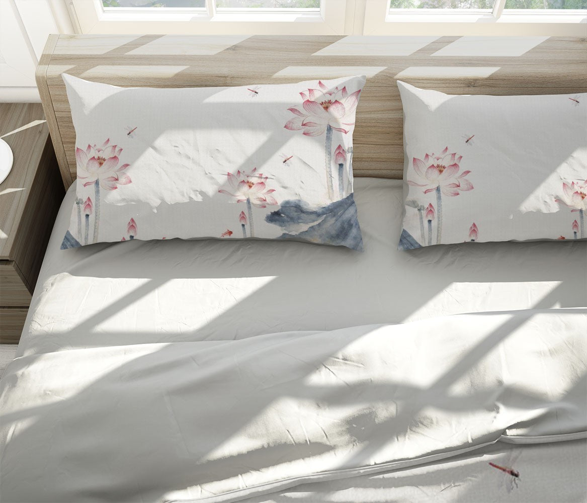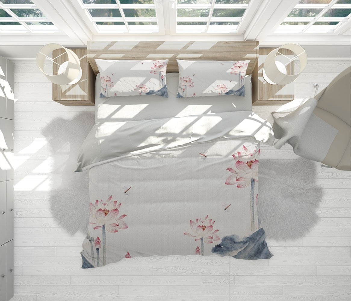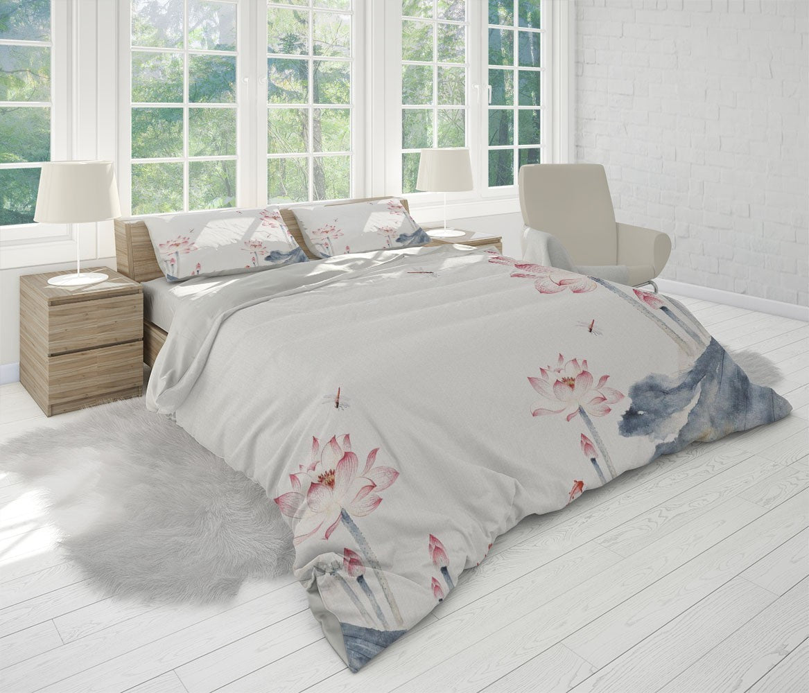Ink Lotus Duvet Cover Set W Pillow Cover, Creamy Art Chinoiserie 3D Quilt Cover, Single Double Queen King Size Doona Cover