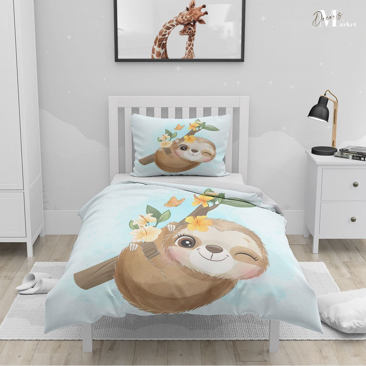 Lovely Sloth Duvet Cover Set w Pillow Cover, Green Kids Animal 3D Quilt Cover, Single Double Queen King Size Doona Cover