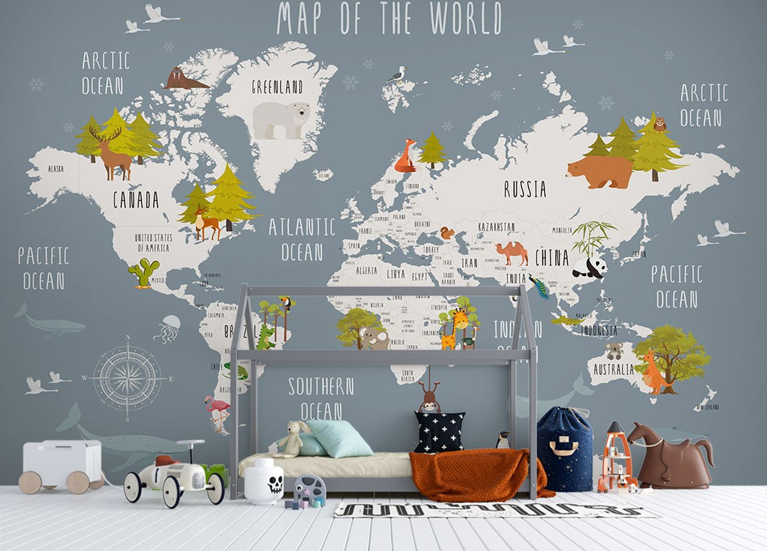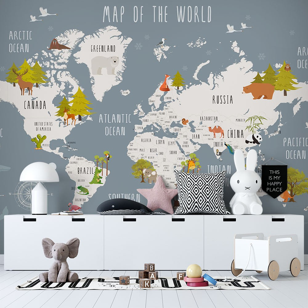 Map Cartoon Kids Kids Map Blue Wallpaper Mural,Self-Adhesive Peel And Stick 3D Wall Mural,Designer Removable Wall Decor