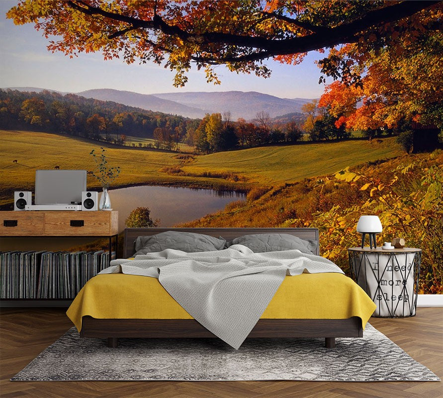 Prairie Lake Forest Seasons Gold Wallpaper Mural,Self-Adhesive Peel And Stick 3D Wall Decor,Designer Bedroom Wall Decor
