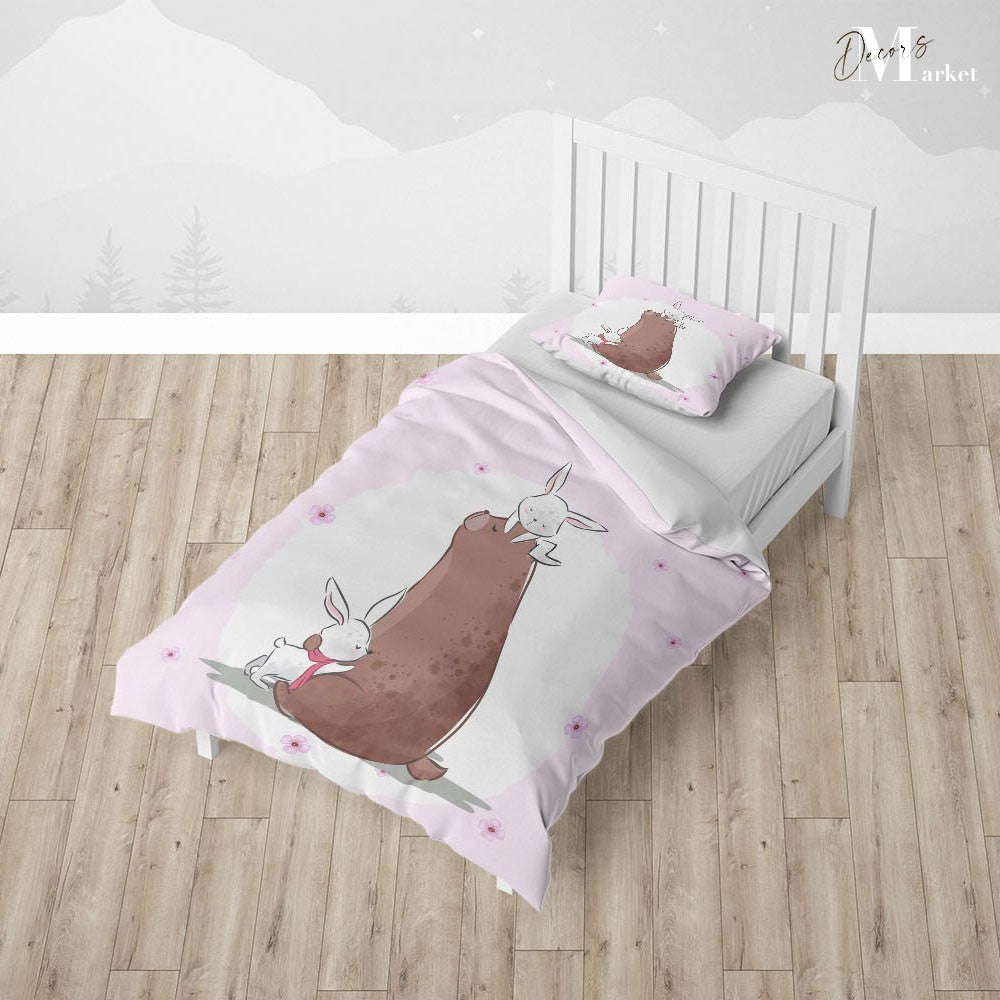 Rabbits Bear Duvet Cover Set w Pillow Cover, Brown Kids Cartoon 3D Quilt Cover, Single Double Queen King Size Doona Cover