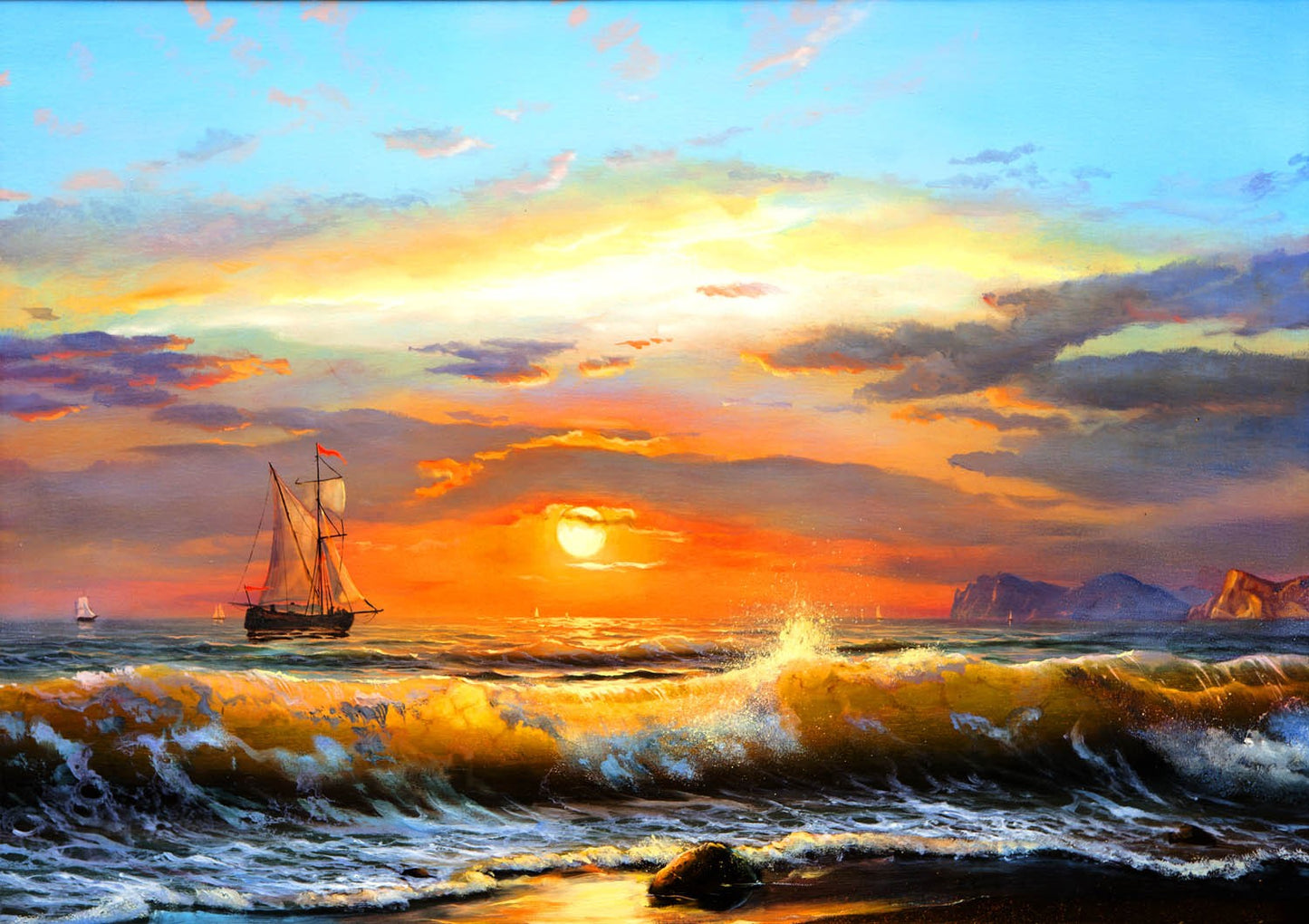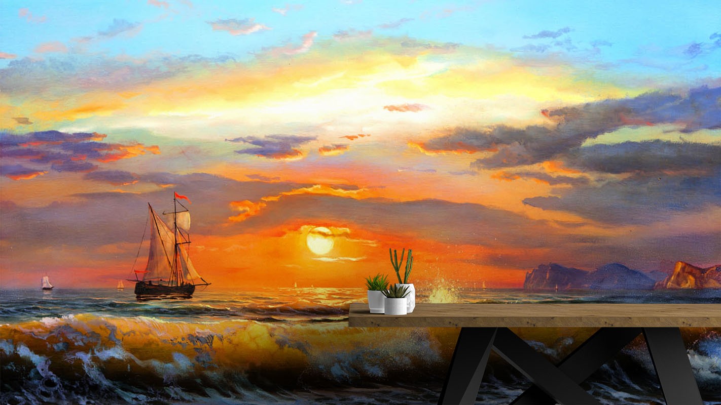 Sailboat Beach Ocean Orange Wallpaper Mural