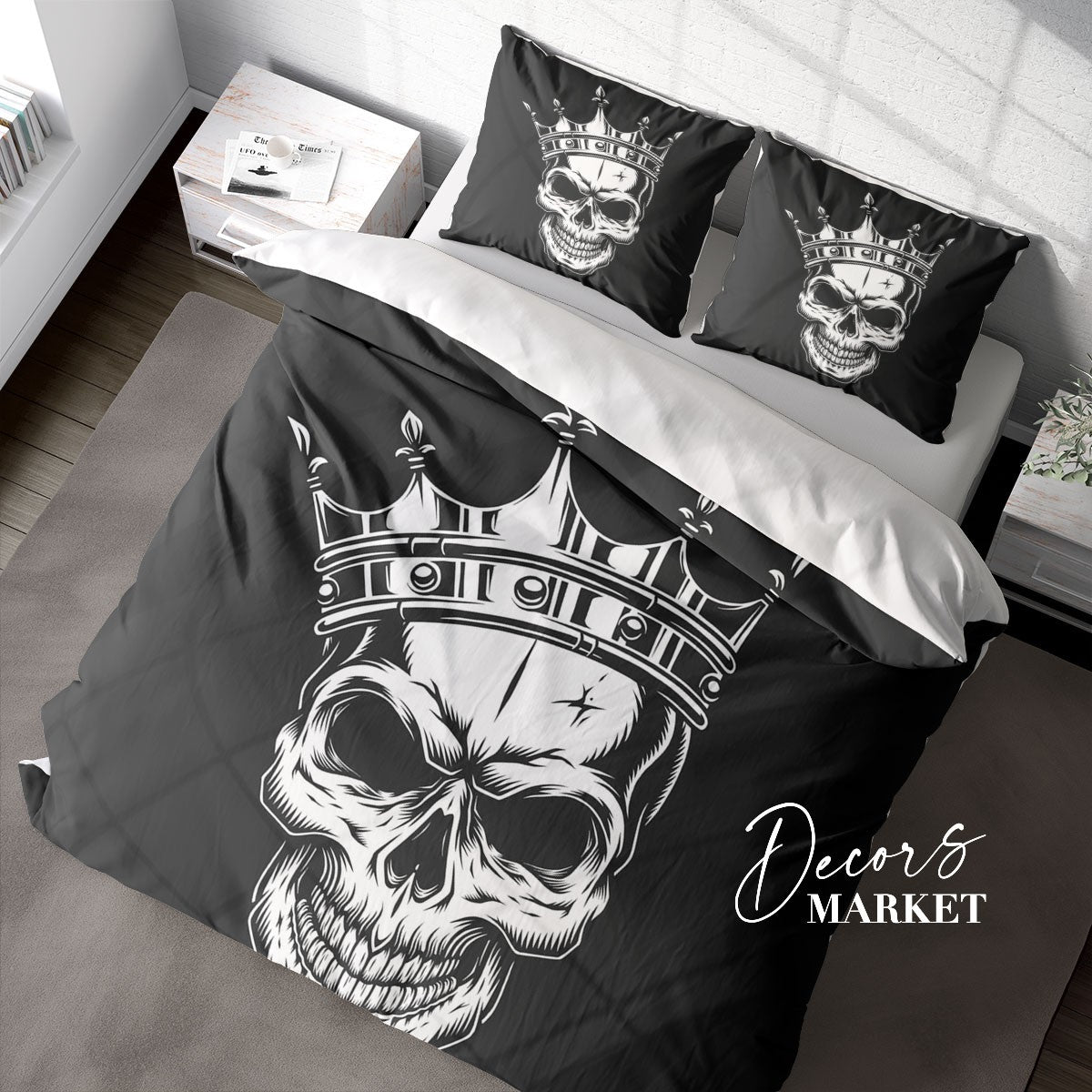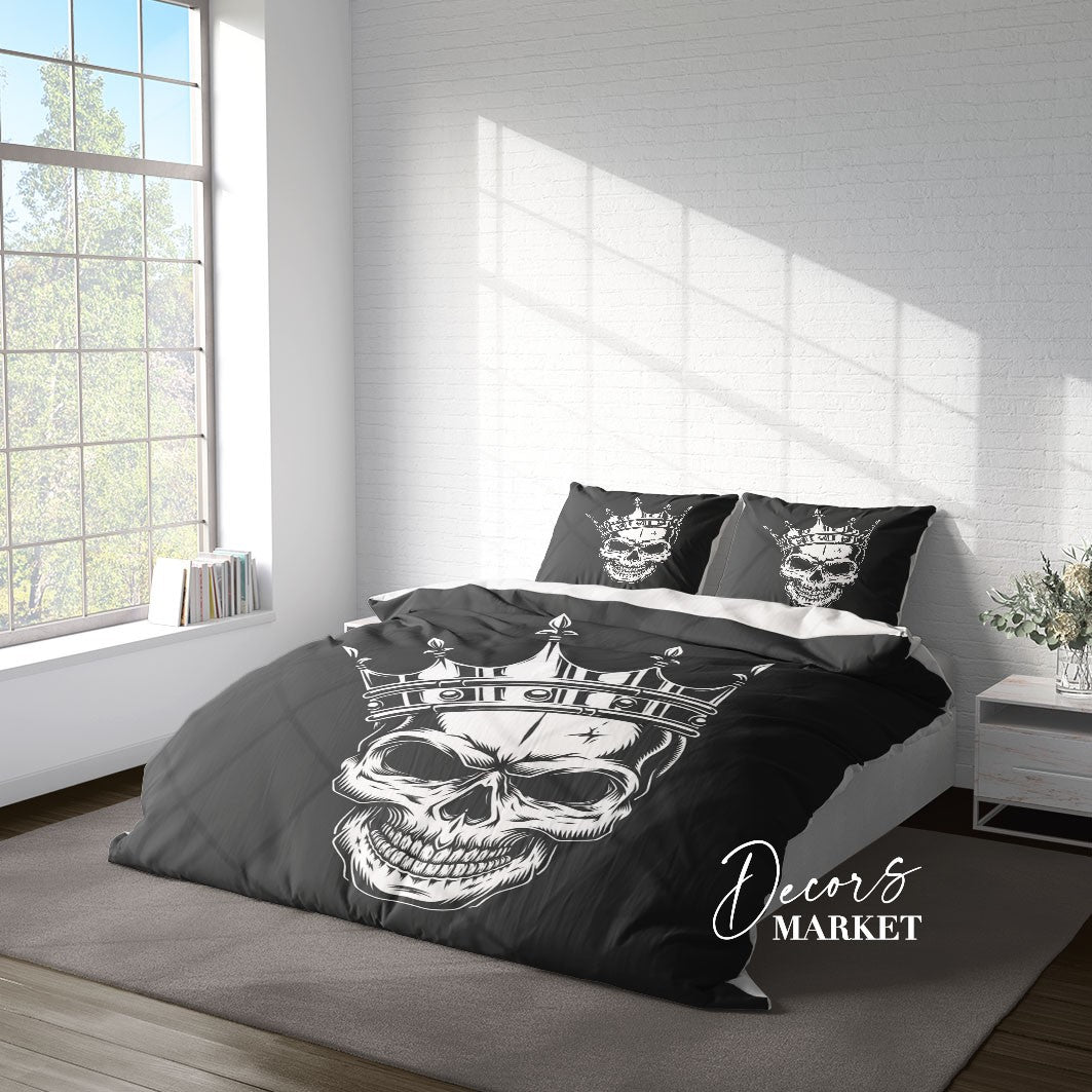 Skeleton Crown Duvet Cover Set w Pillowcases, Black&White Art Fantasy 3D Quilt Cover, 3pc Single Double Queen King Size Doona Cover