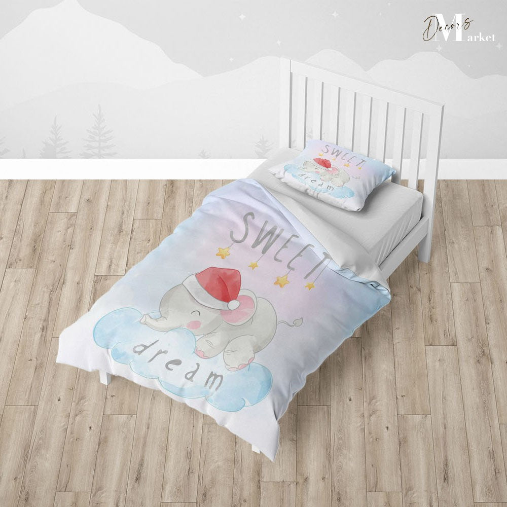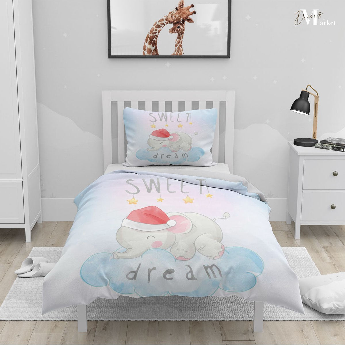 Sweet Dream Elephant Duvet Cover Set w Pillow Cover, Blue Kids Animal 3D Quilt Cover, Single Double Queen King Size Doona Cover