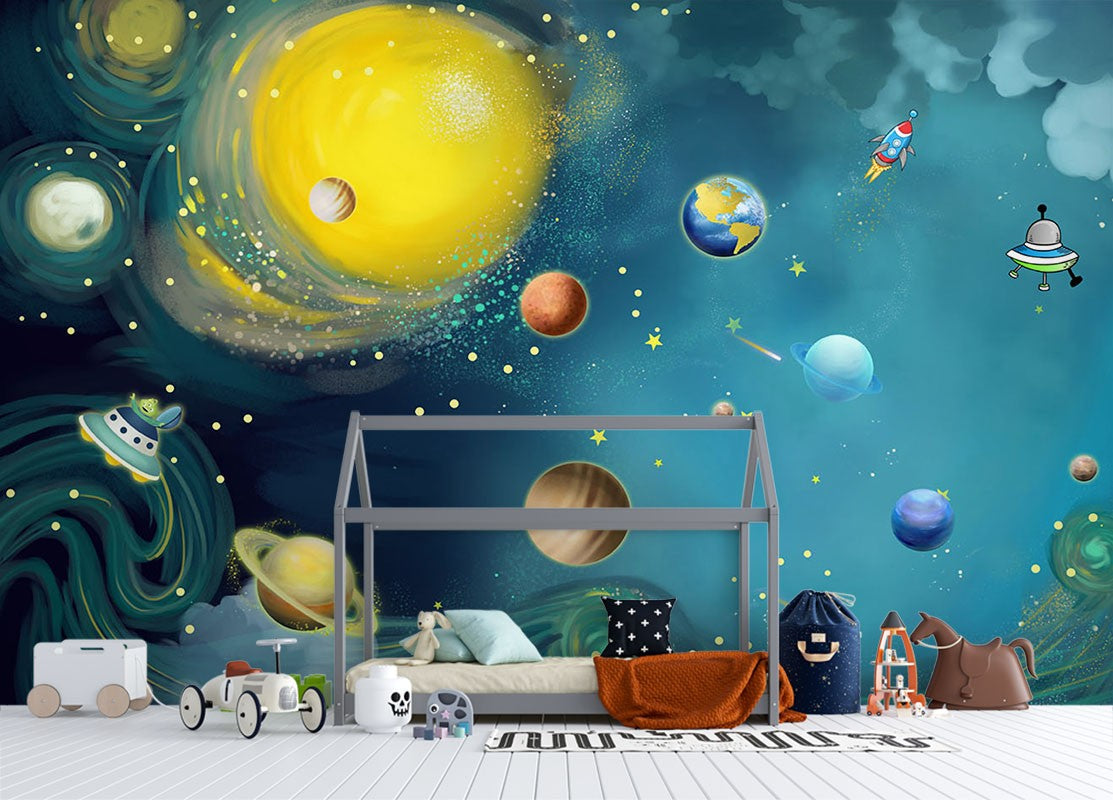 Universe Solar Kids Space Green Wallpaper Mural,Self-Adhesive Peel And Stick 3D Wall Decor,Designer Australian Company Wall Decor