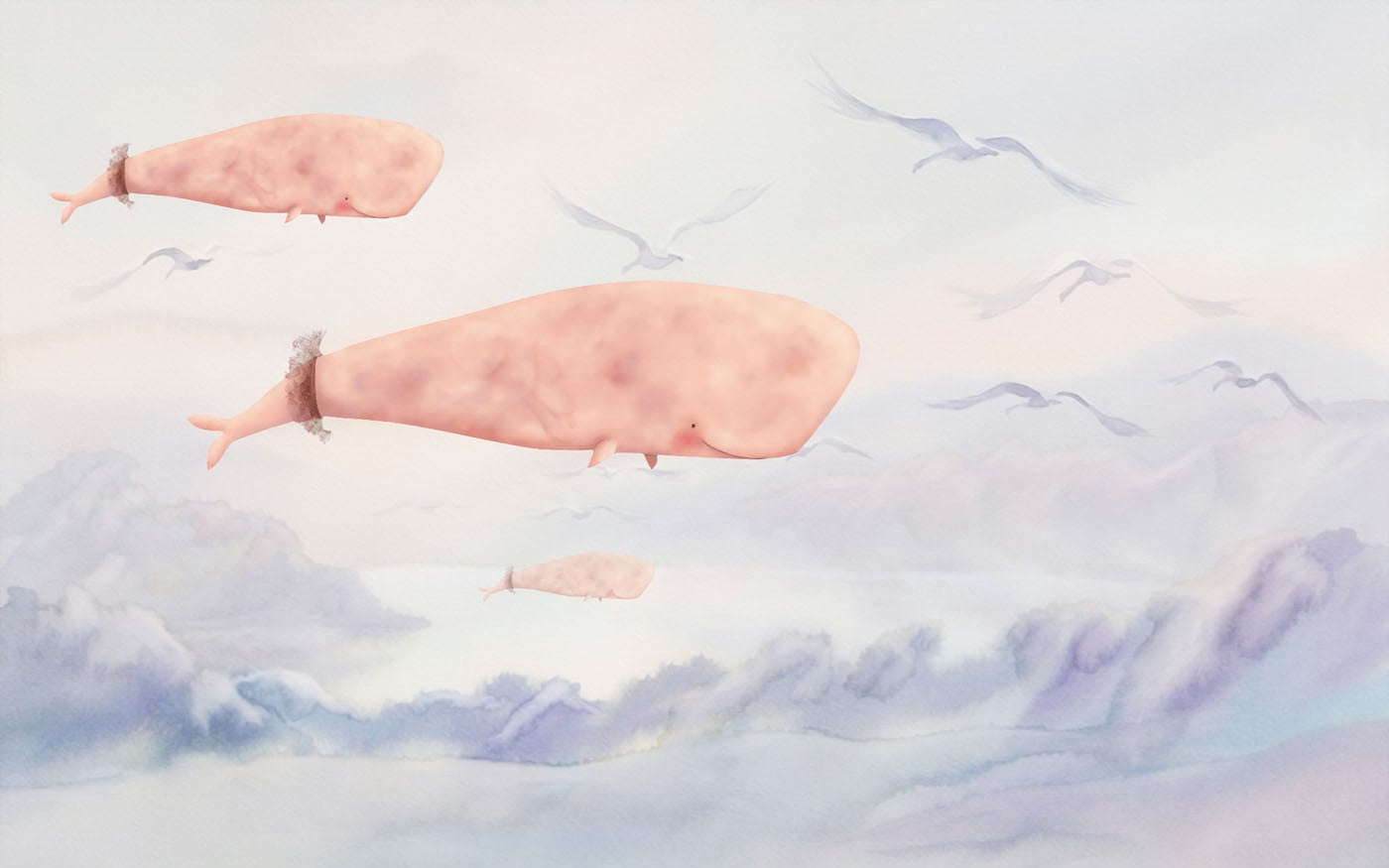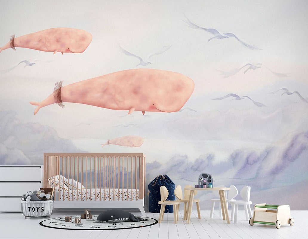 Whale Bird Kids Animal Pink Wallpaper Mural,Self-Adhesive Peel And Stick 3D Wall Decor,Designer Removable Wall Decor