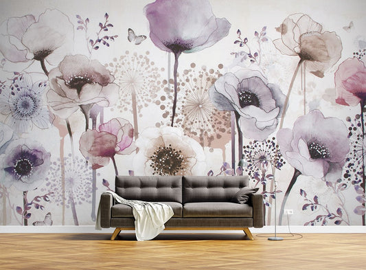Watercolor Flower Field Wallpaper Mural, Purple Flowers Floral Wallpaper, Self-Adhesive Peel And Stick 3D Wall Art,Bedroom Designer Wall Decor