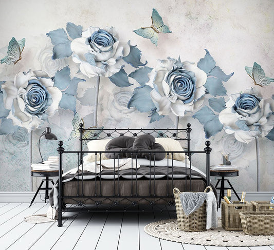 Rose Butterfly Floral Dutch Flowers Blue Wallpaper Mural,Self-Adhesive Peel And Stick 3D Wall Decor,Australian Company Bedroom Wall Decor