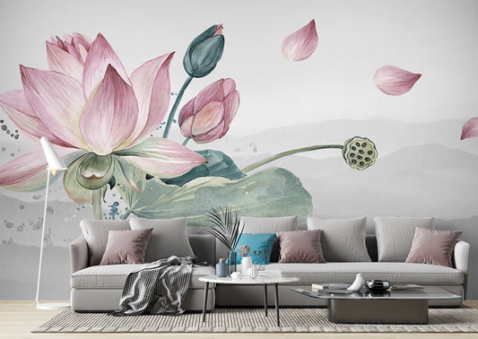 Lotus Floral Dutch Flowers Pink Wallpaper Mural,Self-Adhesive Peel And Stick 3D Wall Decal,Removable Bedroom Wall Decor