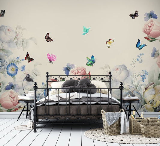 Roses Butterflies Floral Dutch Flowers Creamy Wallpaper Mural,Self-Adhesive Peel And Stick 3D Wall Mural,Removable Bedroom Wall Decor