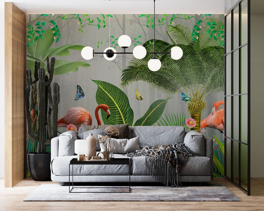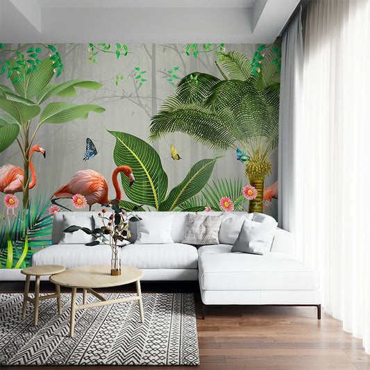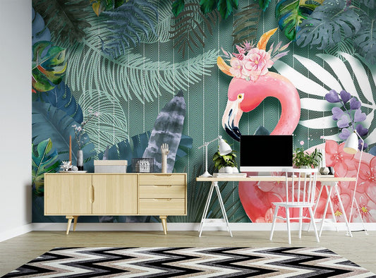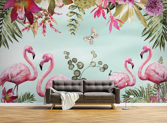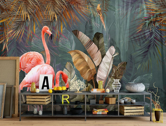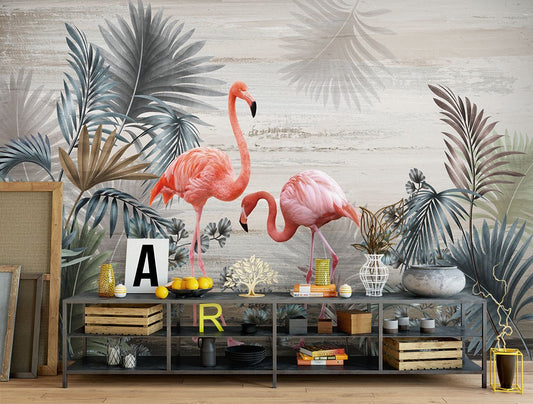 Flamingos Leaves Animals Birds Pink Wallpaper Mural