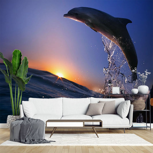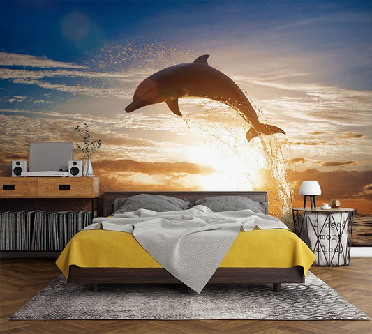 Dolphin Sunset Animals Sea Life Gold Wallpaper Mural,Self-Adhesive Peel And Stick 3D Wall Paper,Bedroom Designer Wall Decor