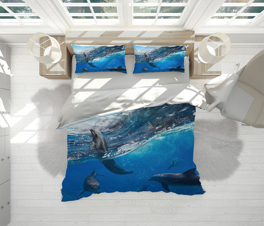 Dolphines Ocean Duvet Cover Set W Pillow Cover, Blue Animals Sea Life 3D Quilt Cover, Single Double Queen King Size Doona Cover