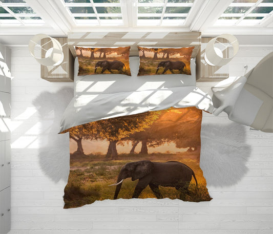 Elephant Sunset Duvet Cover Set W Pillow Cover, Orange Animals Wild Animals 3D Quilt Cover, Single Double Queen King Size Doona Cover