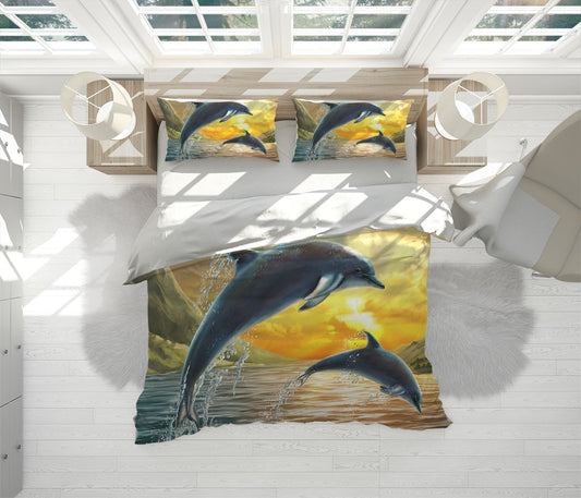 Dolphin Sunset Animals Sea Life Gold 3D Duvet Cover Set W Pillow Cover, Single Double Queen King Size, Printed Cotton Quilt Doona Cover