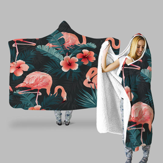 Flamingo Leaves Animals Birds Pink Personalized Hooded Throw Blanket Fleece Hoodie Cape