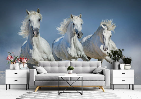 White Horse Animals Horses Blue Wallpaper Mural,Self-Adhesive Peel And Stick 3D Wall Mural,Removable Australian Company Wall Decor