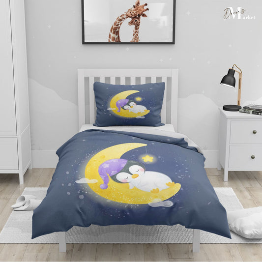 Penguin Moon Sleep Duvet Cover Set w Pillow Cover, Blue Kids Cartoon 3D Quilt Cover, Single Double Queen King Size Doona Cover