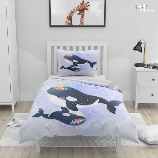 Marine Animal Whale Duvet Cover Set w Pillowcases, Blue Kids Cartoon 3D Quilt Cover, 3pc Single Double Queen King Size Doona Cover