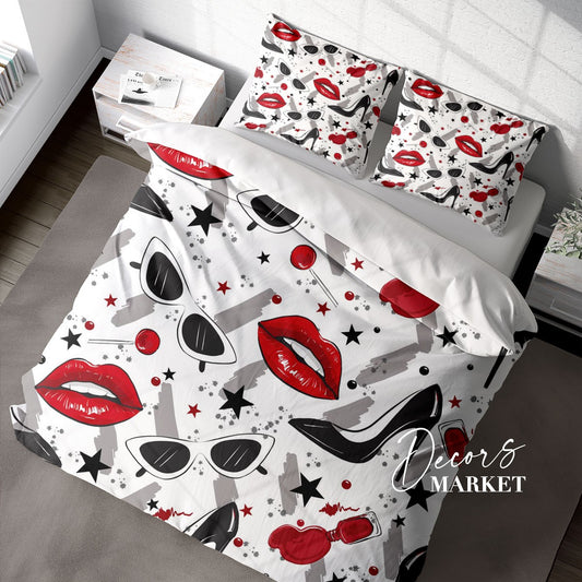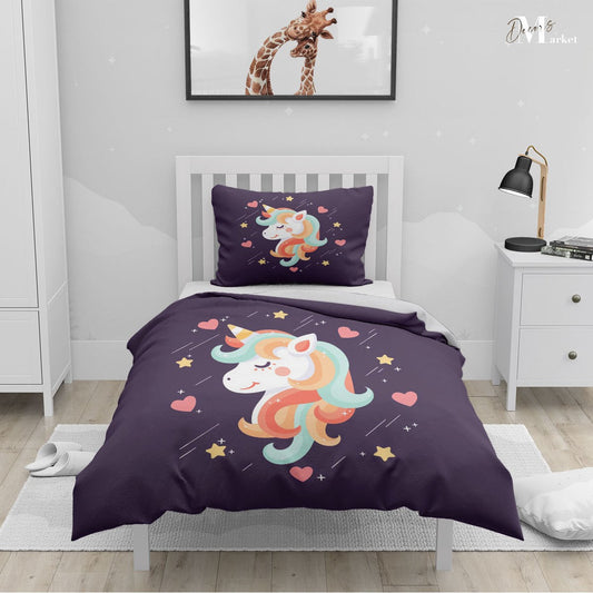 Unicorn Love Star Duvet Cover Set w Pillow Cover, Dark Kids Cartoon 3D Quilt Cover, Single Double Queen King Size Doona Cover