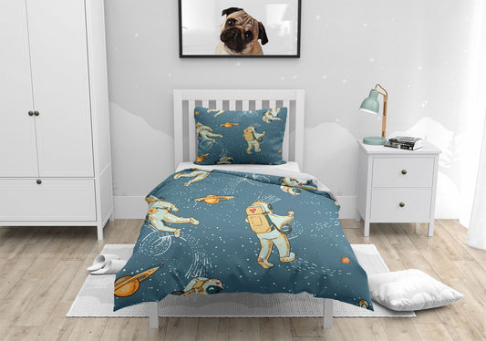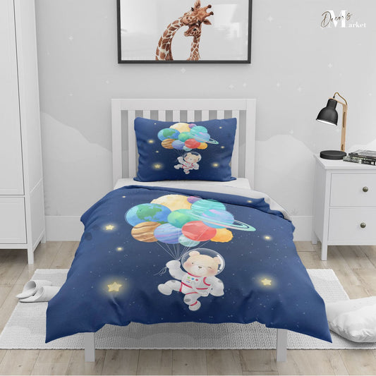 Earth Bear Astronaut Duvet Cover Set w Pillow Cover, Blue Kids Cartoon 3D Quilt Cover, Single Double Queen King Size Doona Cover