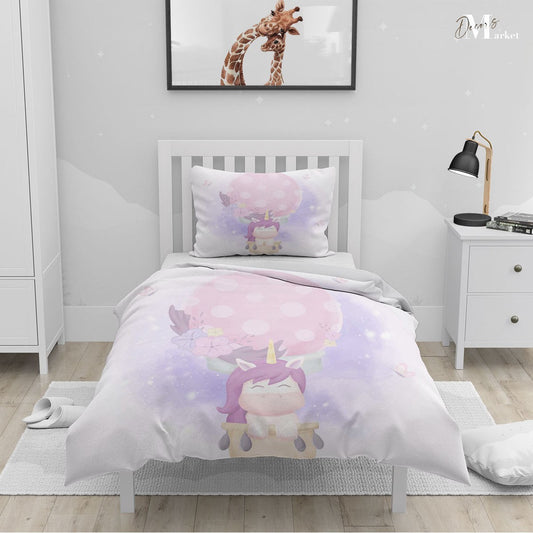 Cute Clouds Unicorn Duvet Cover Set w Pillowcases, Pink Kids Cartoon 3D Quilt Cover, 3pc Single Double Queen King Size Doona Cover