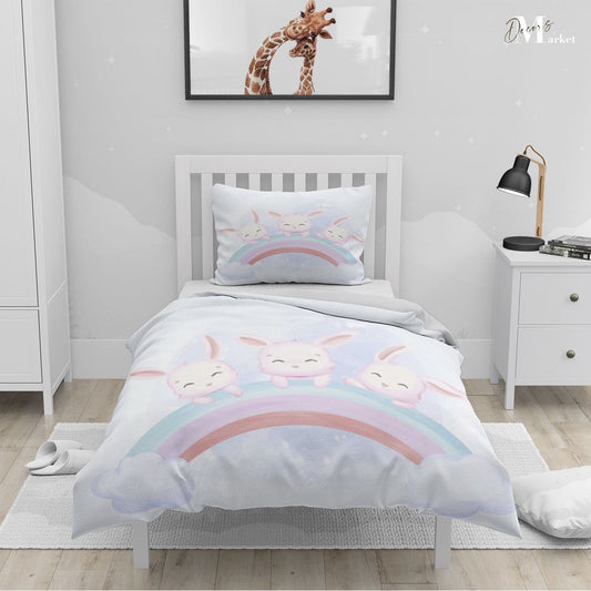 Rabbit Rainbow Duvet Cover Set w Pillow Cover, Blue Kids Cartoon 3D Quilt Cover, Single Double Queen King Size Doona Cover