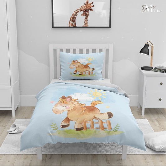 Pony Farm Sunshine Duvet Cover Set w Pillow Cover, Blue Kids Cartoon 3D Quilt Cover, Single Double Queen King Size Doona Cover