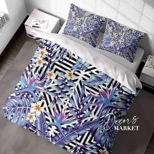 Tropical Flower Leaf Art Duvet Cover Set w Pillowcases, Purple Floral Patterns 3D Quilt Cover, 3pc Single Double Queen King Size Doona Cover