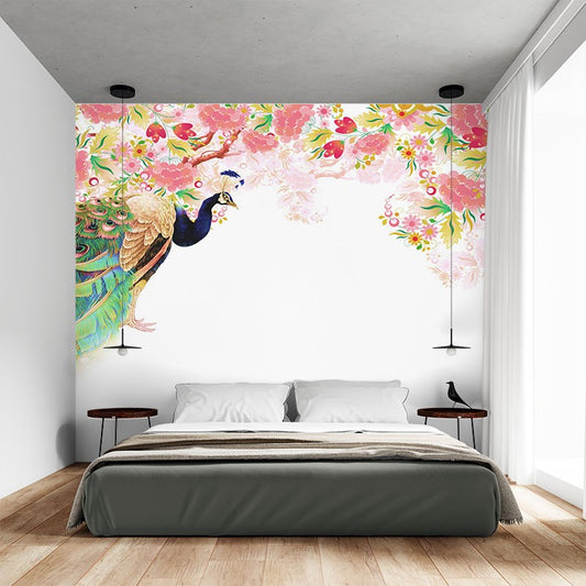 Peacock Cherry Animals Pink Wallpaper Mural,Self-Adhesive Peel And Stick 3D Wall Art,Removable Bedroom Wall Decor