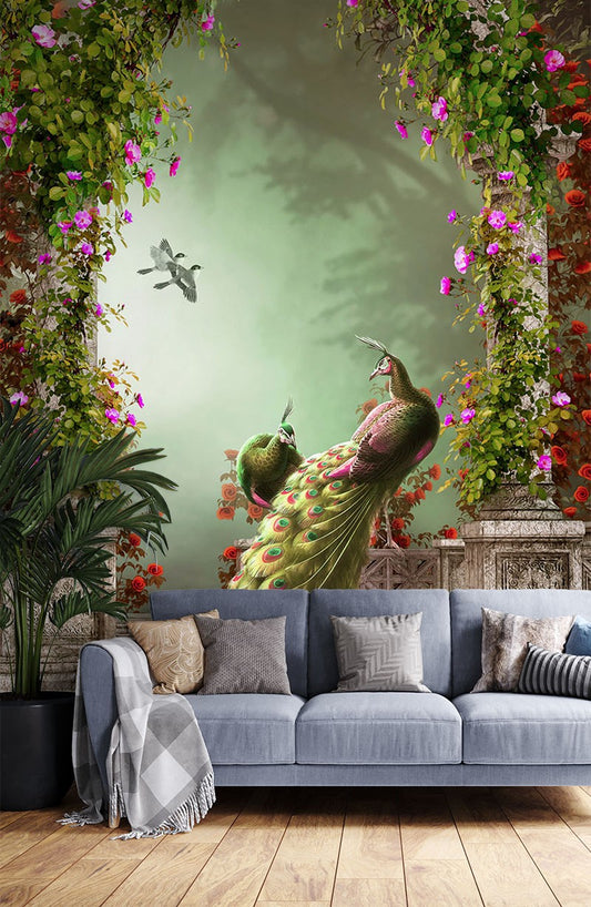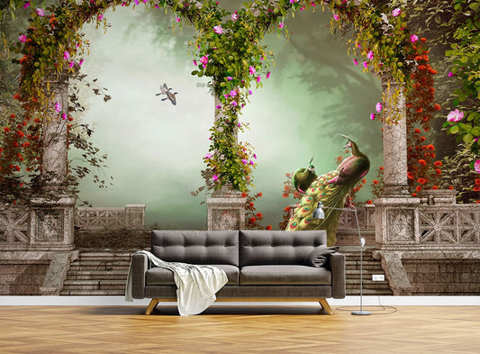 Peacock Castle Animals Green Wallpaper Mural,Self-Adhesive Peel And Stick 3D Wall Mural,Designer Australian Company Wall Decor
