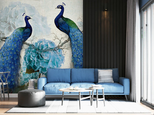 Peacocks Dutch Flowers Animals Peacock Blue Wallpaper Mural,Self-Adhesive Peel And Stick 3D Wall Decor,Bedroom Designer Wall Decor