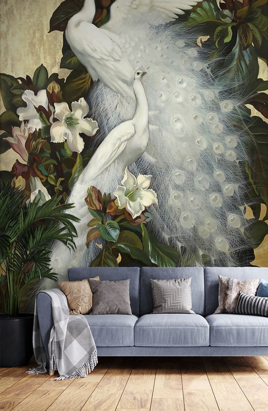 White Peacock Animals White Wallpaper Mural,Self-Adhesive Peel And Stick 3D Wall Paper,Designer Bedroom Wall Decor