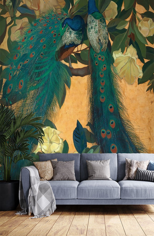 Peacocks Dutch Flowers Animals Peacock Bright Wallpaper Mural,Self-Adhesive Peel And Stick 3D Wall Decal,Designer Bedroom Wall Decor