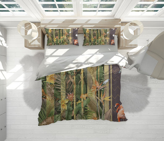 Tropical Flamingo Duvet Cover Set w Pillowcases, Green Animals Birds 3D Quilt Cover, 3pc Single Double Queen King Size Doona Cover