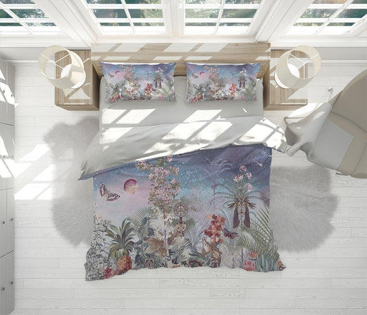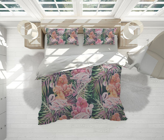 Flamingo Jungle Duvet Cover Set w Pillowcases, Green Pink Animals Birds 3D Quilt Cover, 3pc Single Double Queen King Size Doona Cover