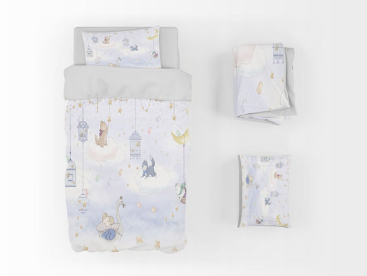Bear Kiss Bird Duvet Cover Set w Pillow Cover, Blue Kids Cartoon 3D Quilt Cover, Single Double Queen King Size Doona Cover