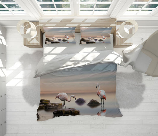 Flamingo Sea Duvet Cover Set W Pillow Cover, Creamy Animals Birds 3D Quilt Cover, Single Double Queen King Size Doona Cover
