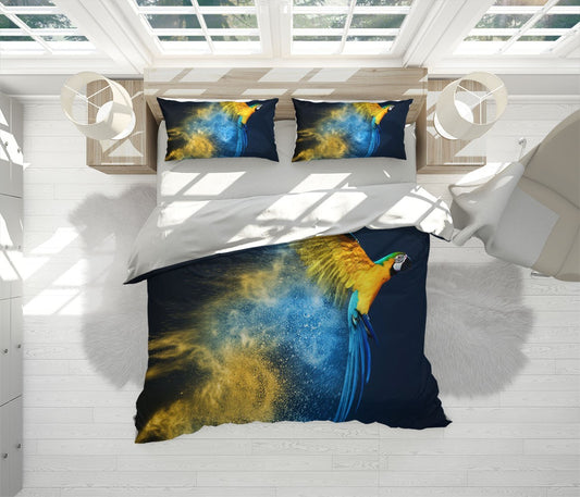 Golden Parrot Duvet Cover Set W Pillow Cover, Blue Animals Birds 3D Quilt Cover, Single Double Queen King Size Doona Cover