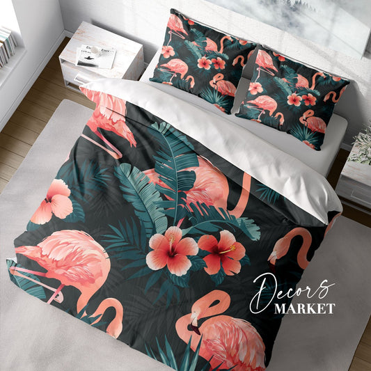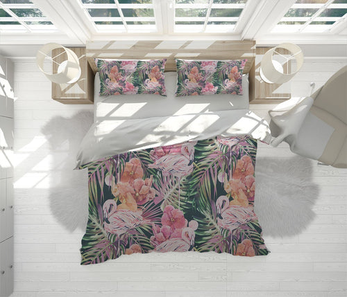 Flamingo Leaves Duvet Cover Set w Pillowcases, Black Pink Animals Birds 3D Quilt Cover, 3pc Single Double Queen King Size Doona Cover
